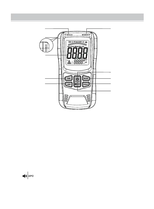 VEVOR EM4556 - EMF Tester Front Panel Overview; EF Sensing Area; RF Sensing Area; Display Screen