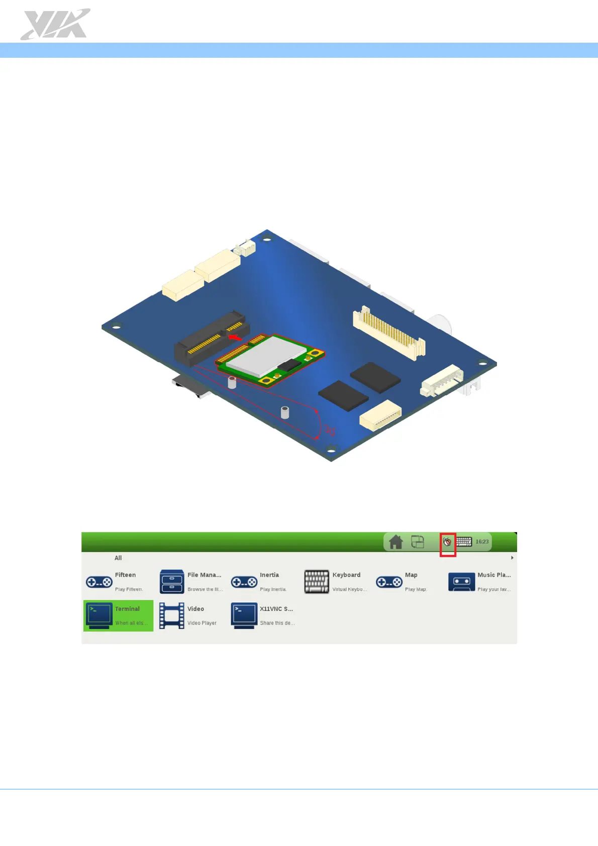 The first step is to insert the EMIO-1541 module into the miniPCIe slot. After installing