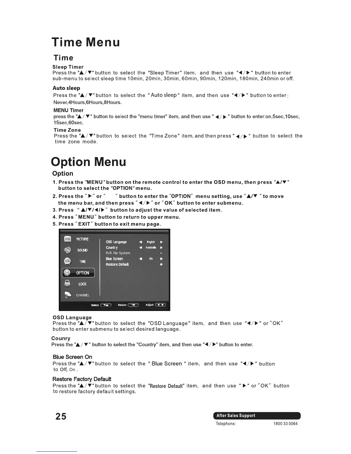 VIANO LED40FHD - Time and Option Menu Configurations; Sleep Timer and Time Zone Settings; OSD Language and Country Selection; Blue Screen and Factory Reset Options