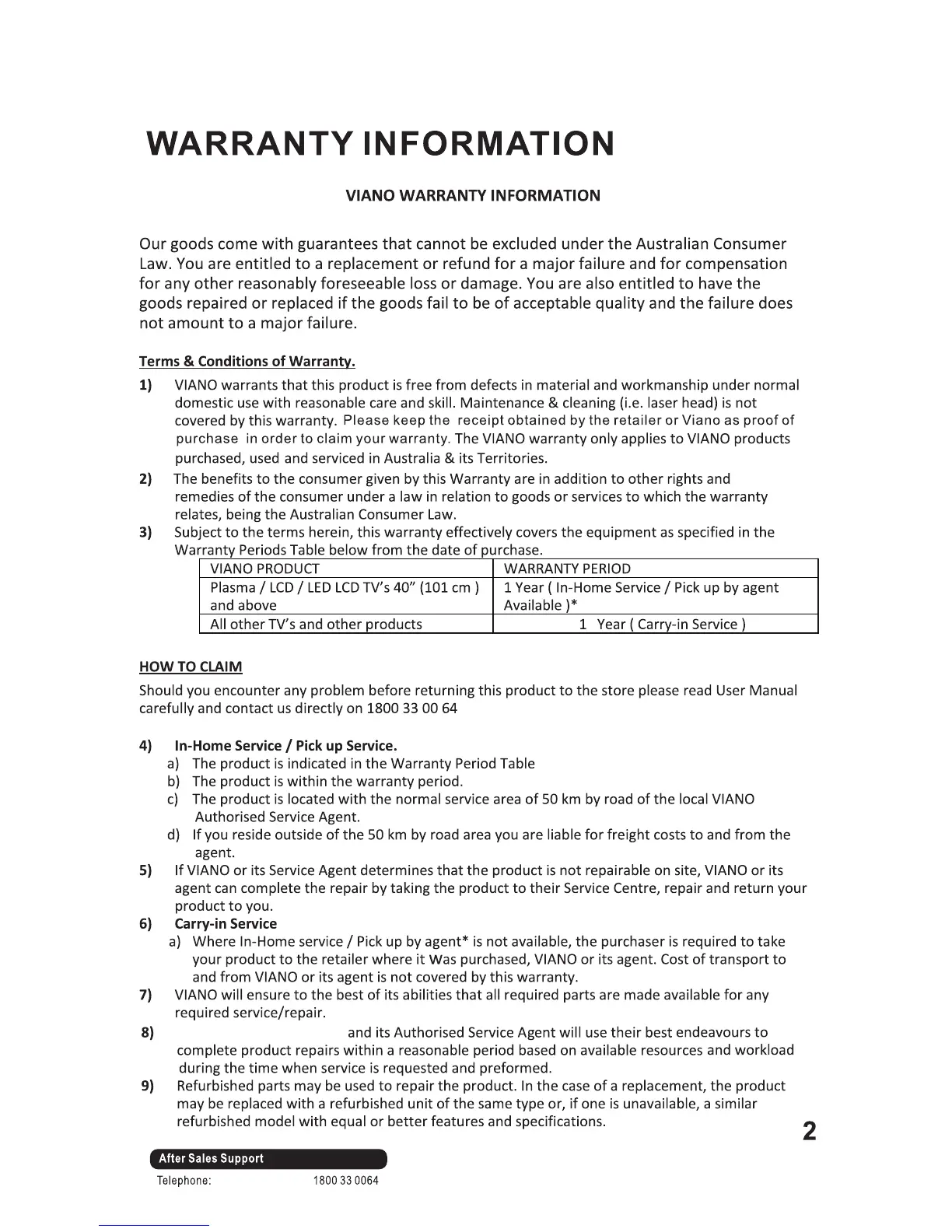 VIANO LED40FHD - Warranty Information; Terms and Conditions of Warranty; How to Claim Warranty