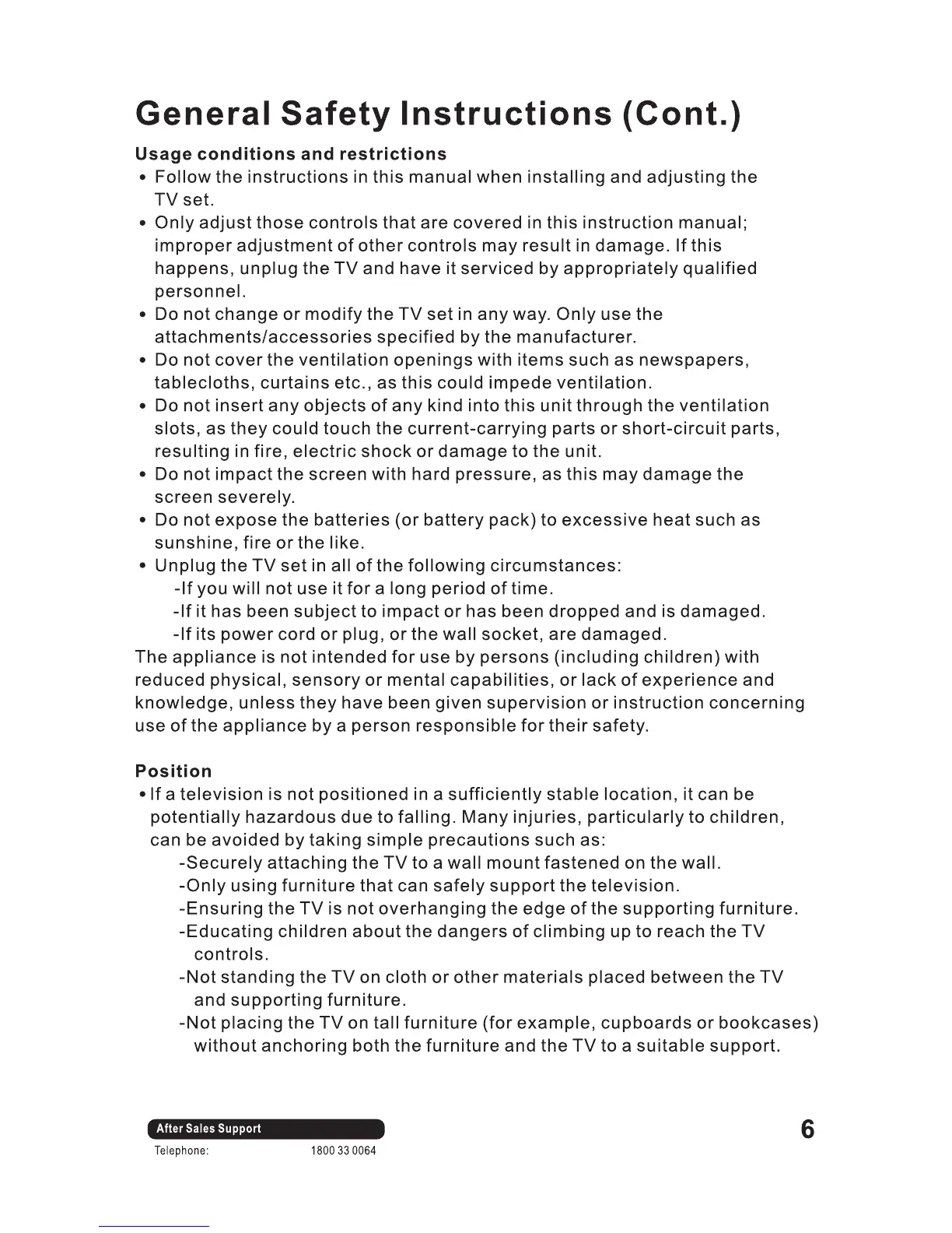 VIANO LED40FHD - General Safety Instructions (Continued); Usage Conditions and Restrictions; TV Placement and Stability