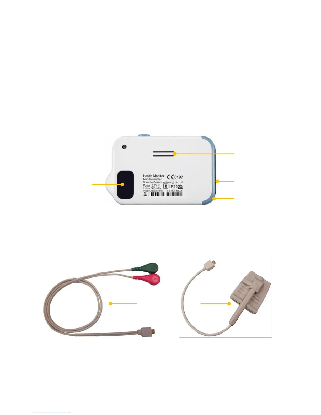 It connects with external SpO2 cable, ECG cable, or charging cable.