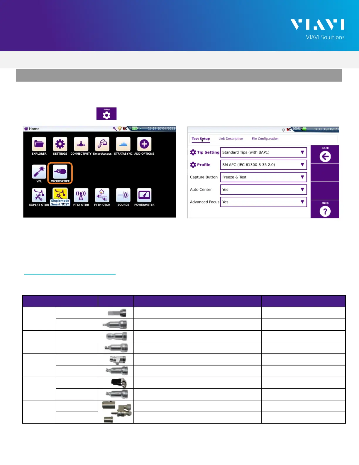 MicroUSB cable and move the appropriate tip setting onto the SmartOTDR. For more information,