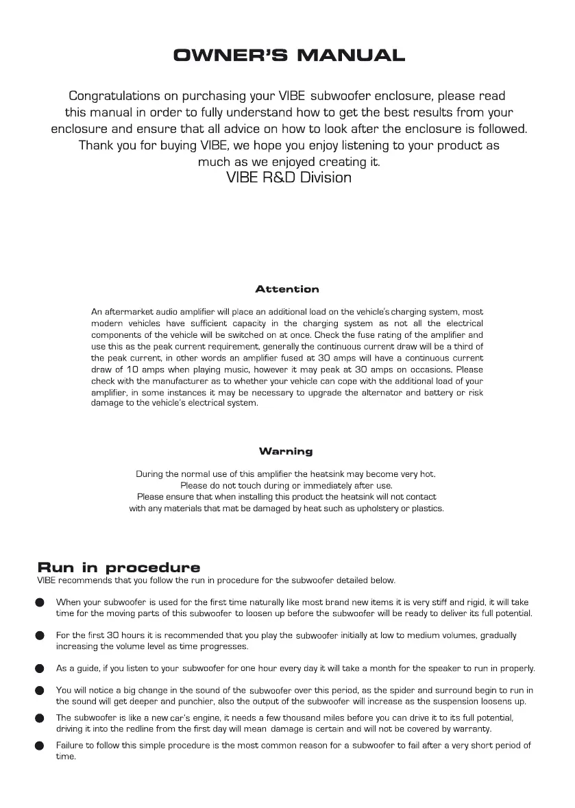 Vibe Optisound Auto 8 - OWNERS MANUAL; Attention; Warning; Run in procedure