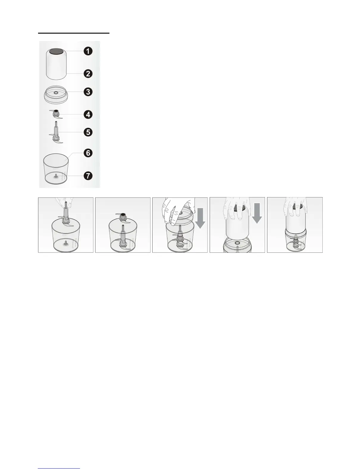 1. Place the Bottom blade (5) onto the axis (7) in the bowl (6) as the above