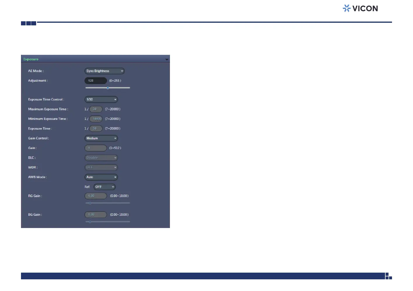 Adjusts the exposure from 0~255. Users can enter the value or adjust it