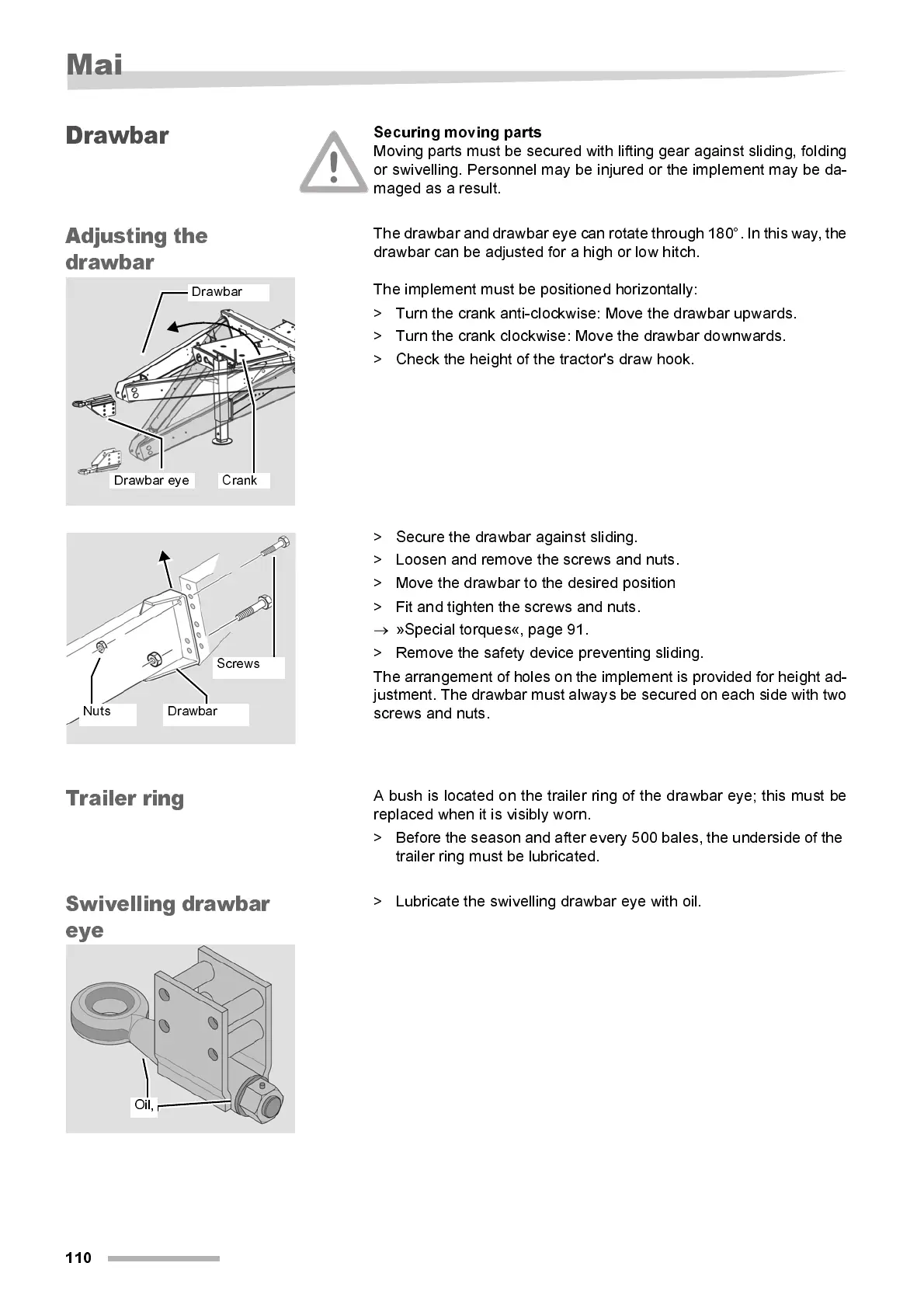> Lubri cate the swi vell i ng draw bar eye w i th oi l .