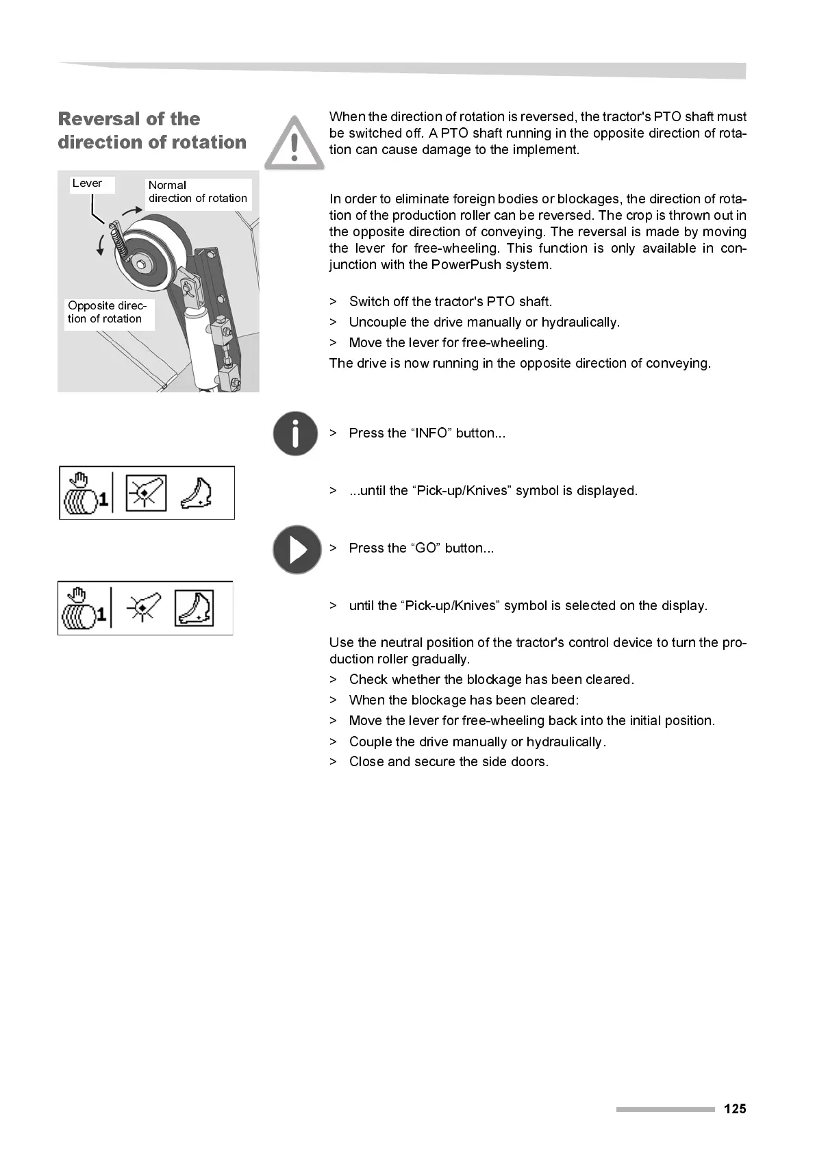 When the direction of rotation is reversed, the tractor's PTO shaft must