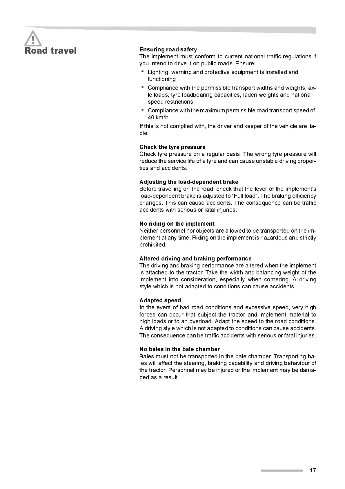 The i mplement must conform to current nati onal traffic regulations if