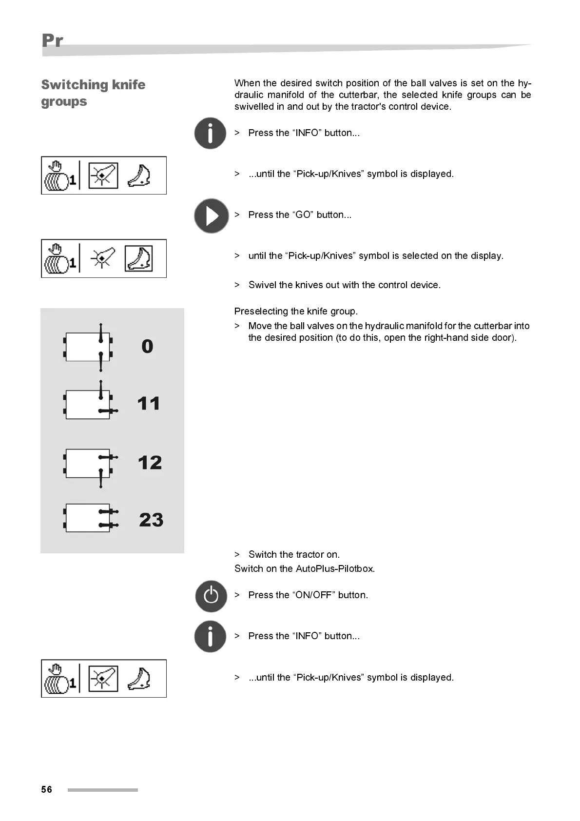 > Move the ball valves on the hydraulic manifold for the cutterbar into