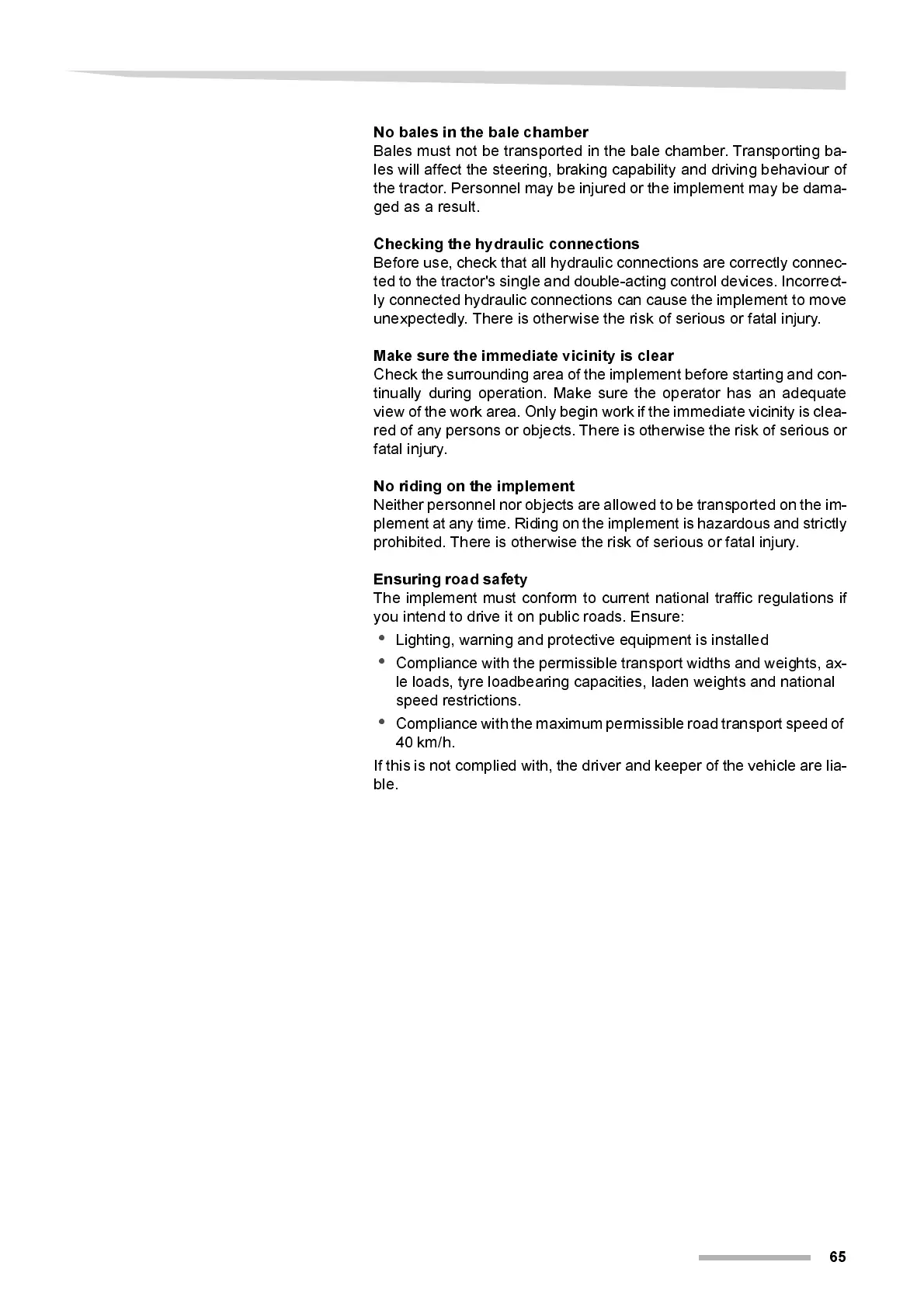 Bal es must not be tr ansported in the bal e chamber. Transporti ng ba-