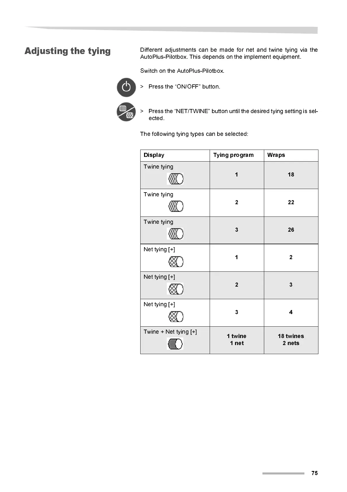 > Press the “NET/TWINE” button until the desired tying setting is sel-
