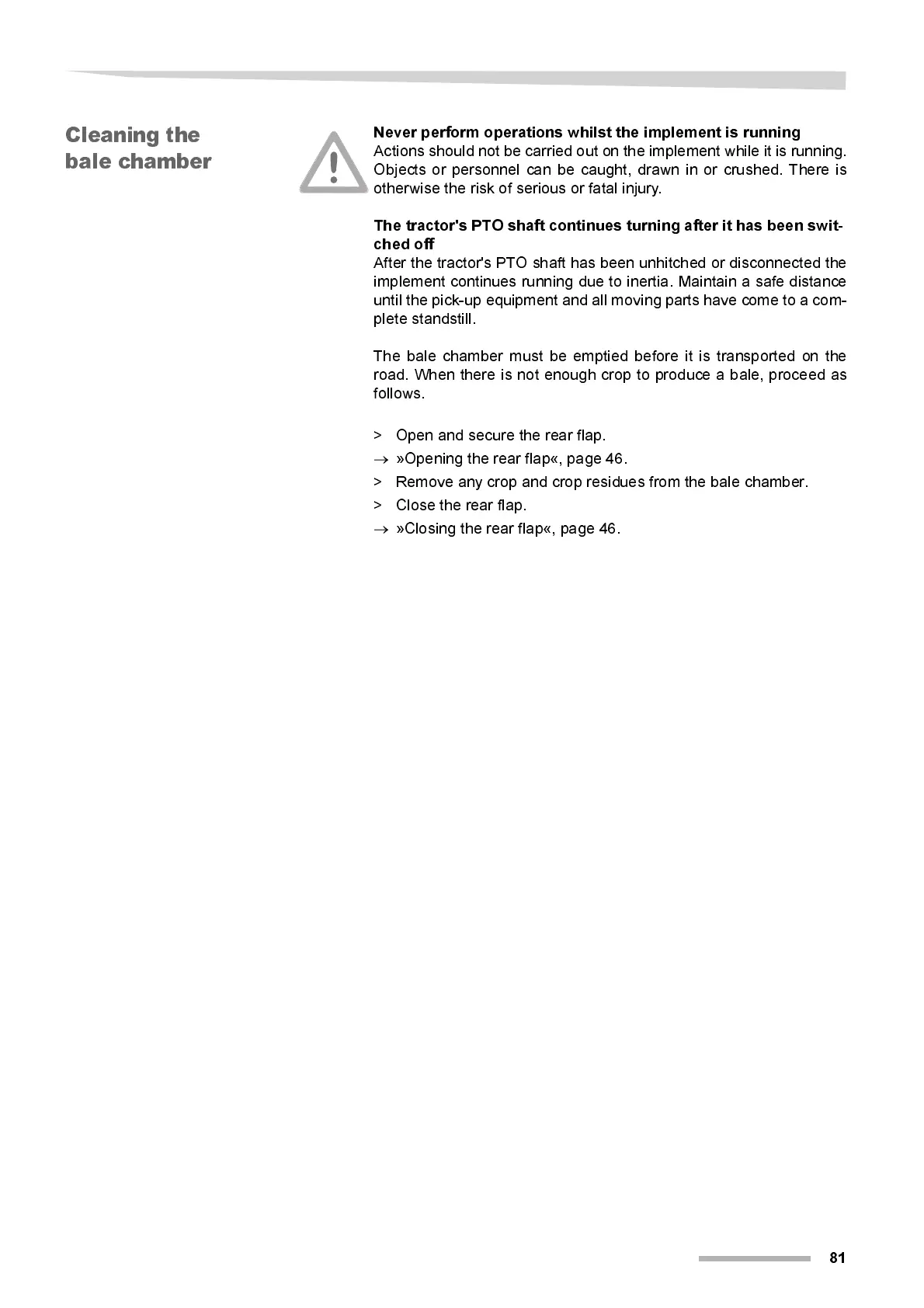 The bale chamber must be emptied before it is transported on the