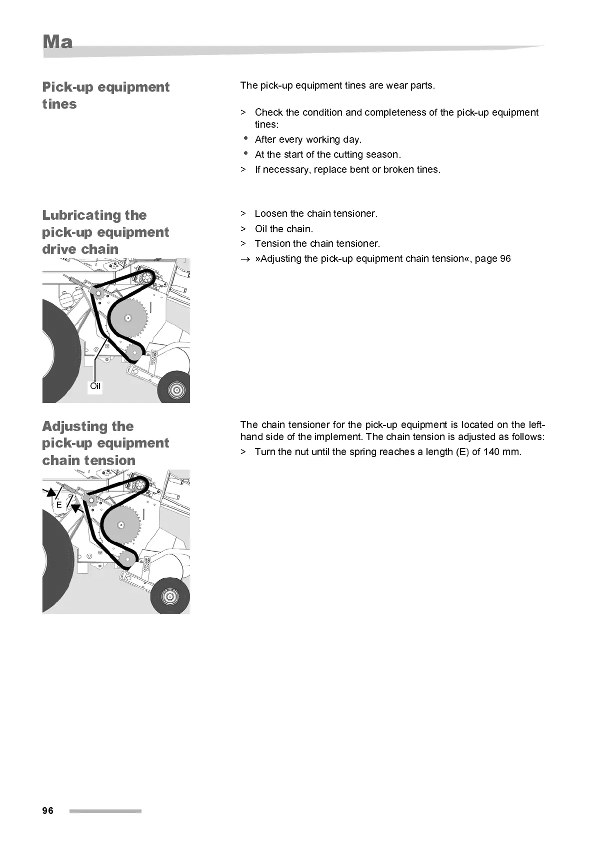 »Adjusting the pick-up equipment chain tension«, page 96