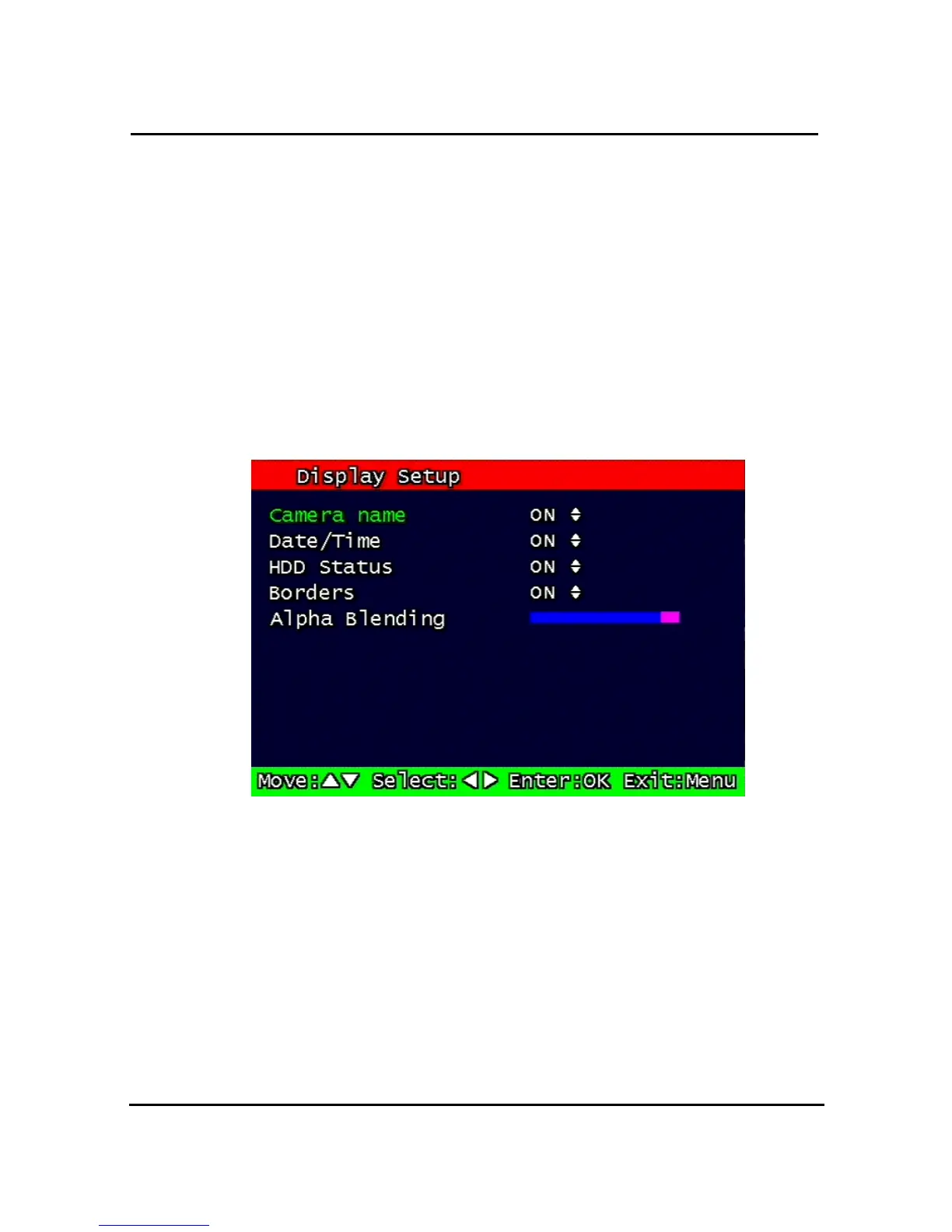 Determine whether to have the following be shown on the monitor: Camera name, Time/Date, HDD