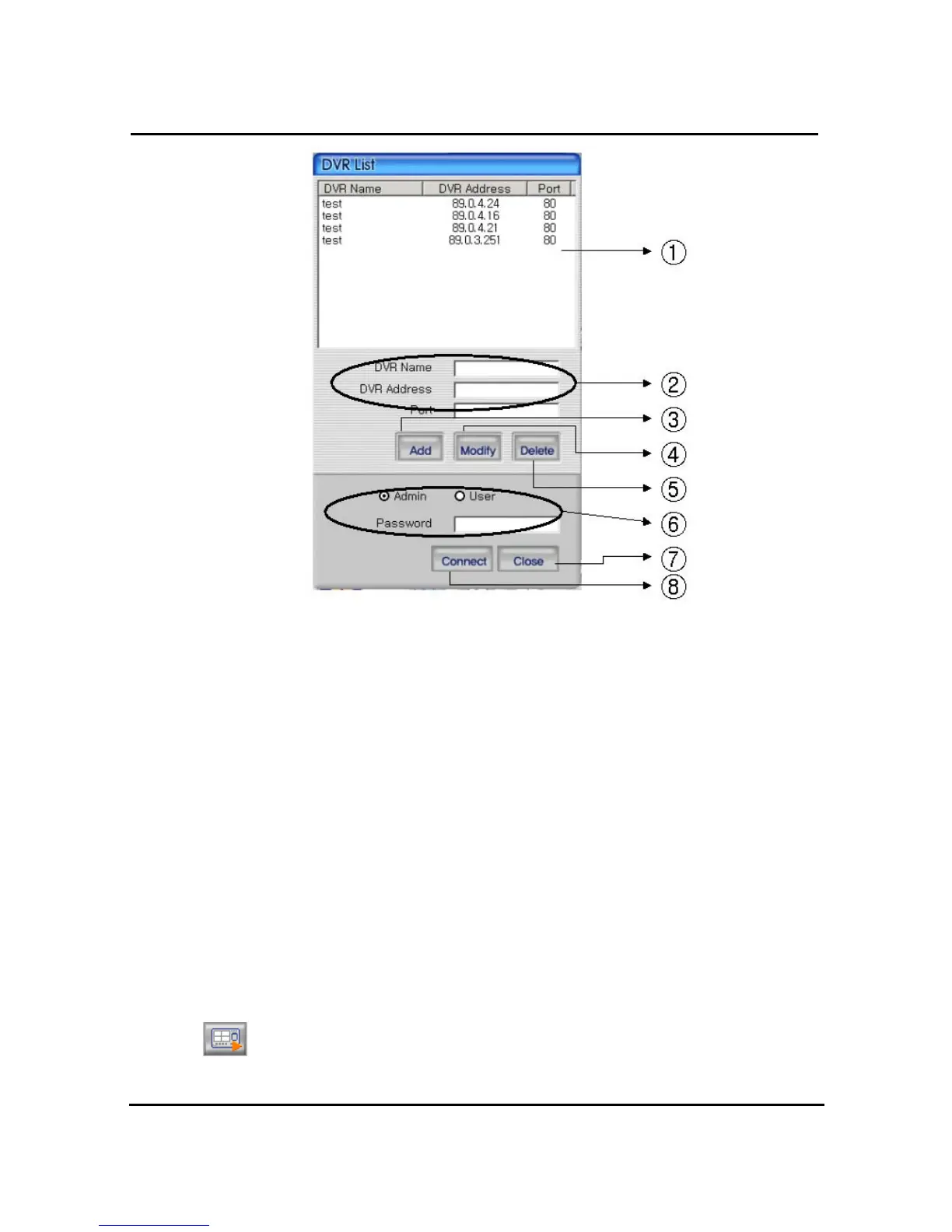 ⑧ Click Connect after correct password has been entered to connect to the desired DVR.