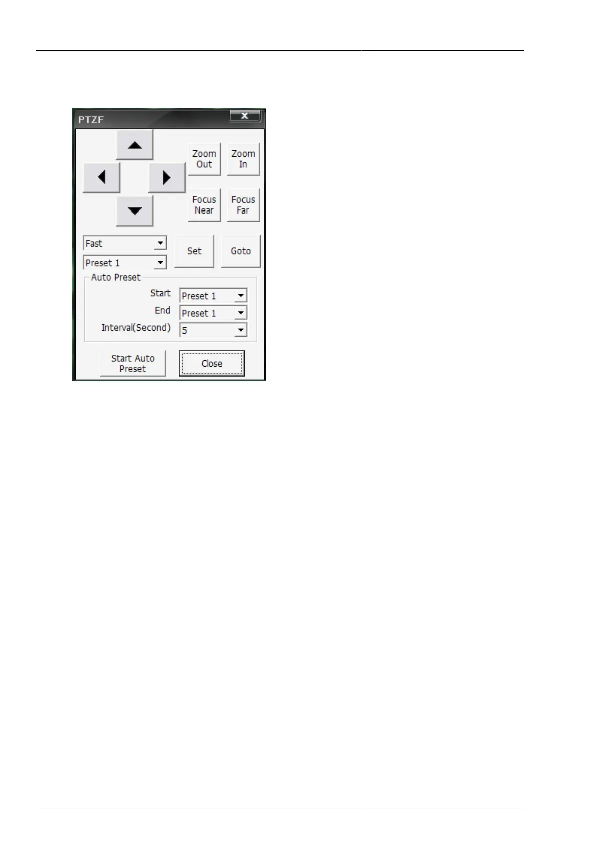 The user can control PTZF speed, Preset, Auto preset, Pan/Tilt, Zoom/Focus from the currently displayed channel,