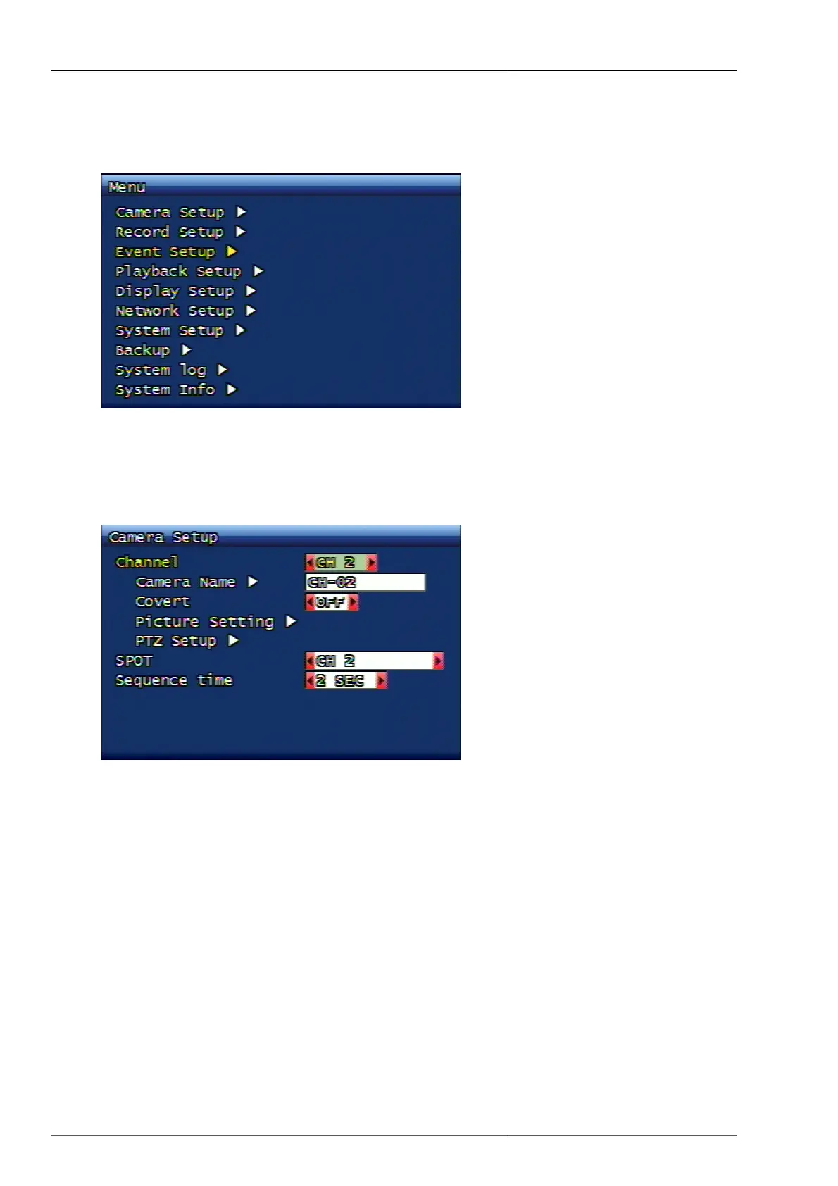 You can select the channel for camera setup. In this case live screen automatically changes to the channel you