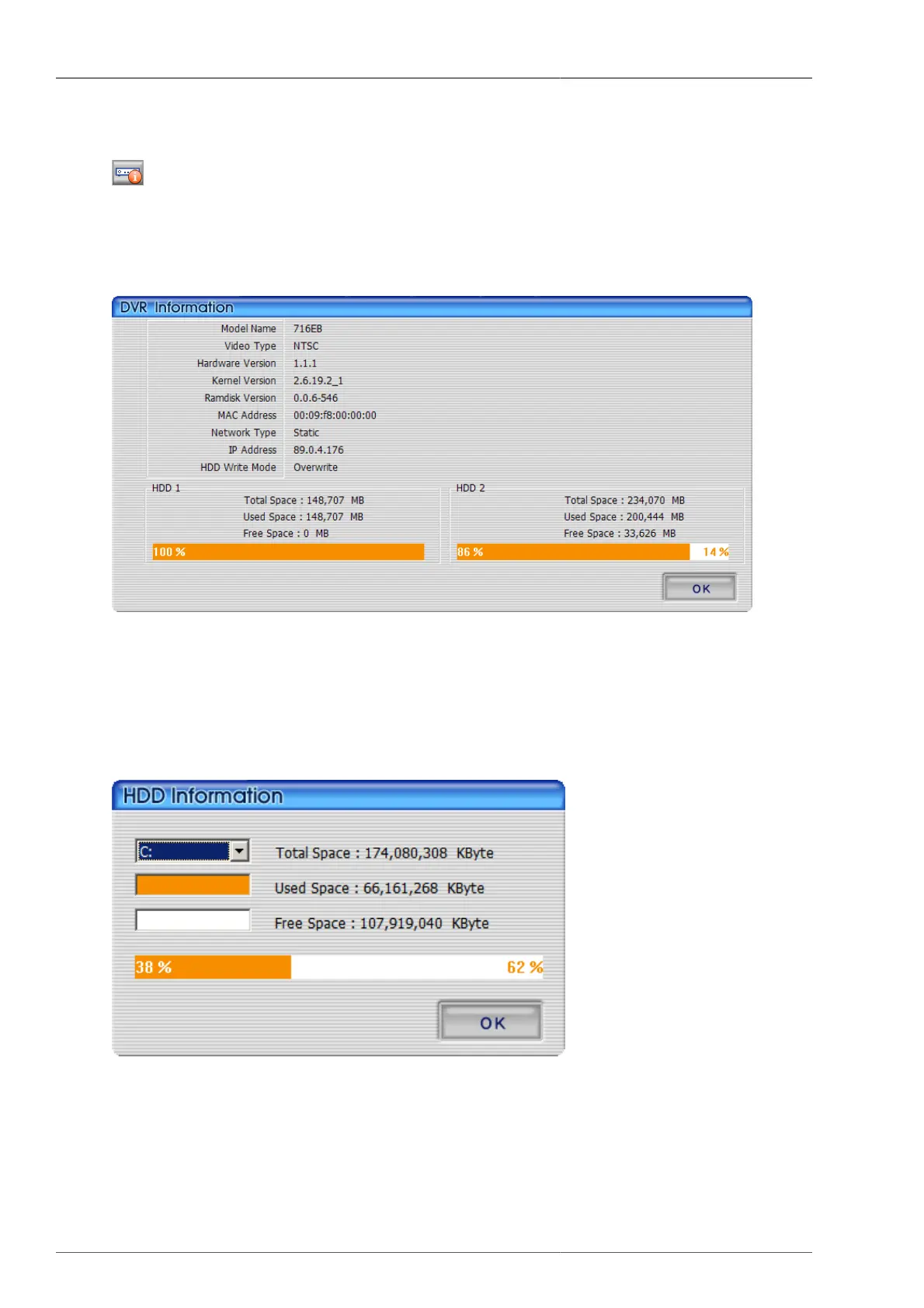 The user can verify DVR model, video type, program version, MAC address, network type, IP address, HDD