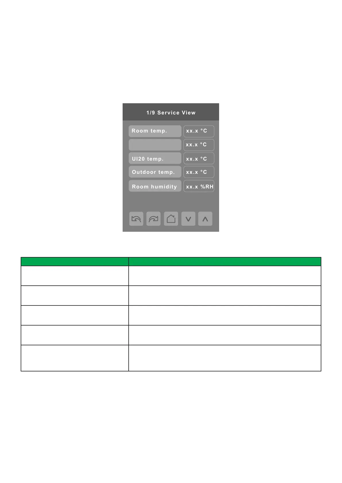 The service view screens show the current status of certain points locally on the Room Controller. These points can also be