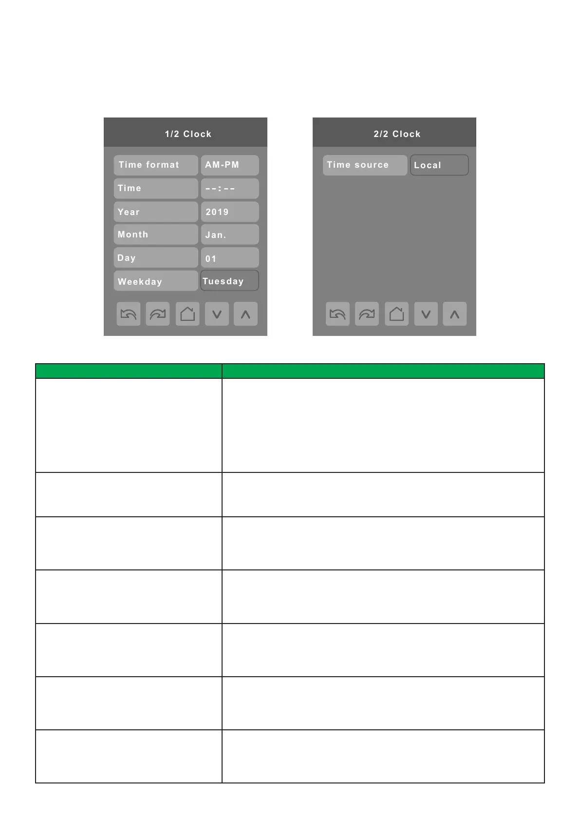 The Clock settings screen allows the device’s internal time settings to be changed (current time, day, month, year and weekday