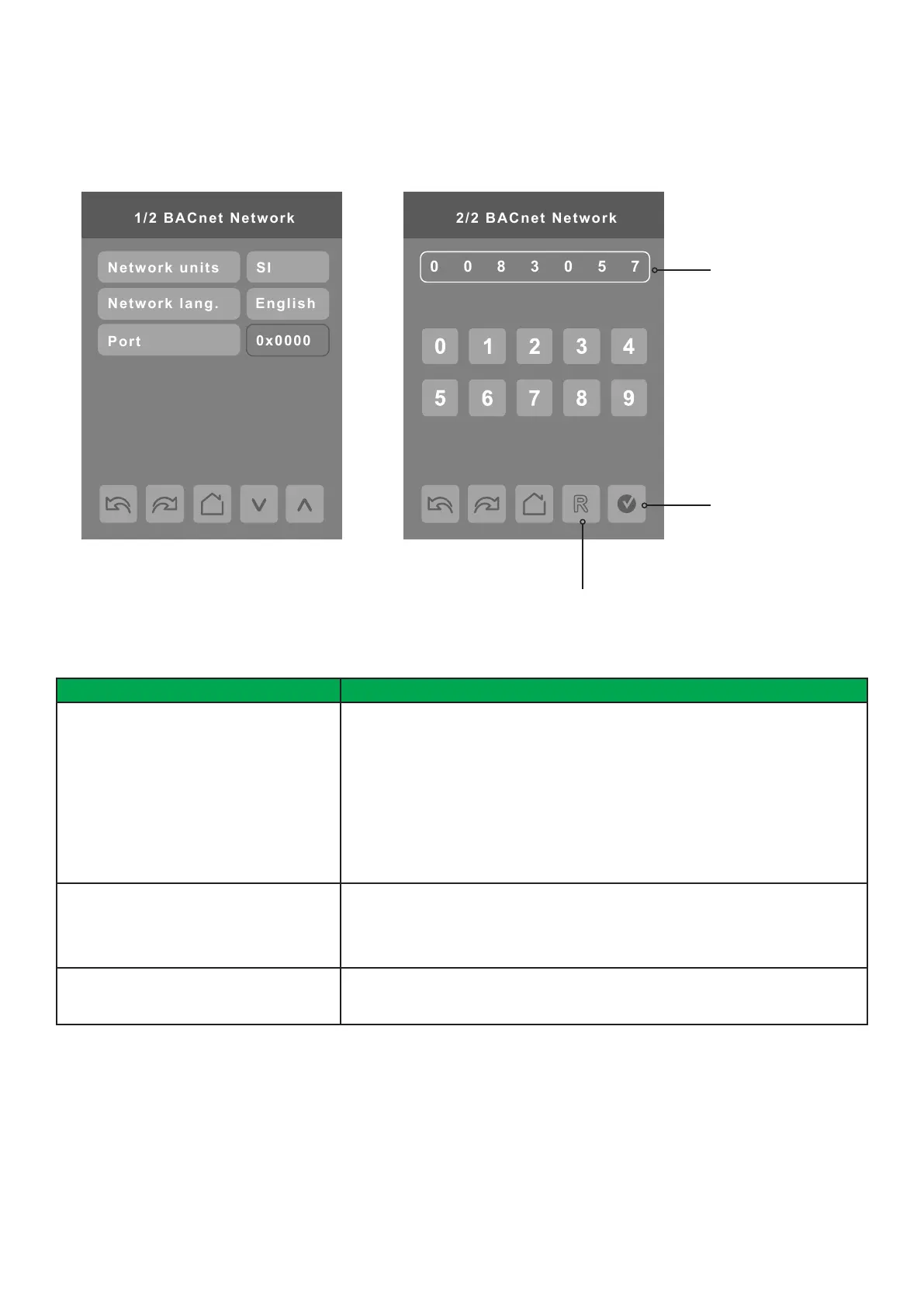 BACnet network screens are shown when the wired protocol is set to BACnet or a Wi-Fi module is installed with BACnet/IP