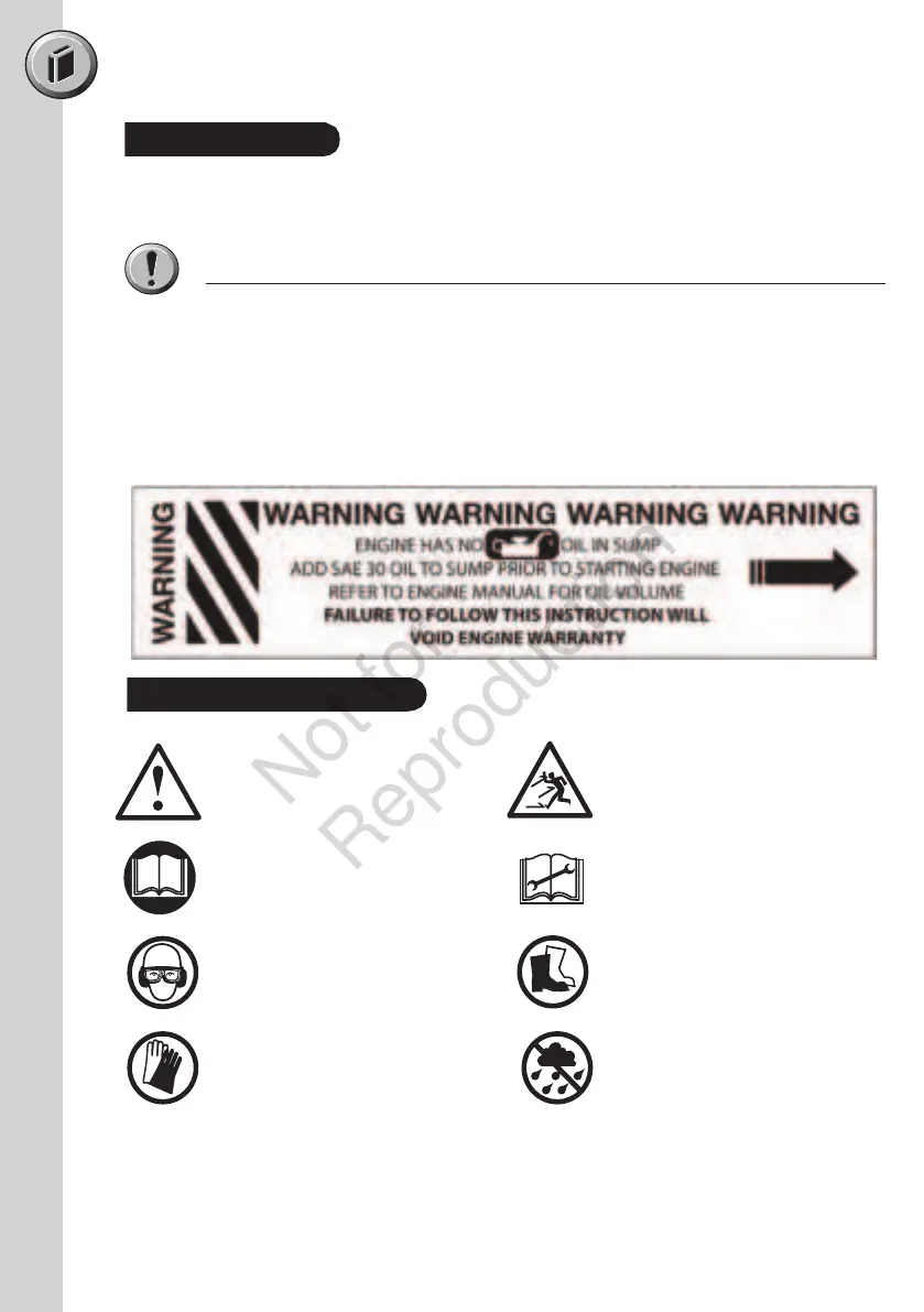 Engine must have SAE 30 Oil added to the Engine Sump before starting.