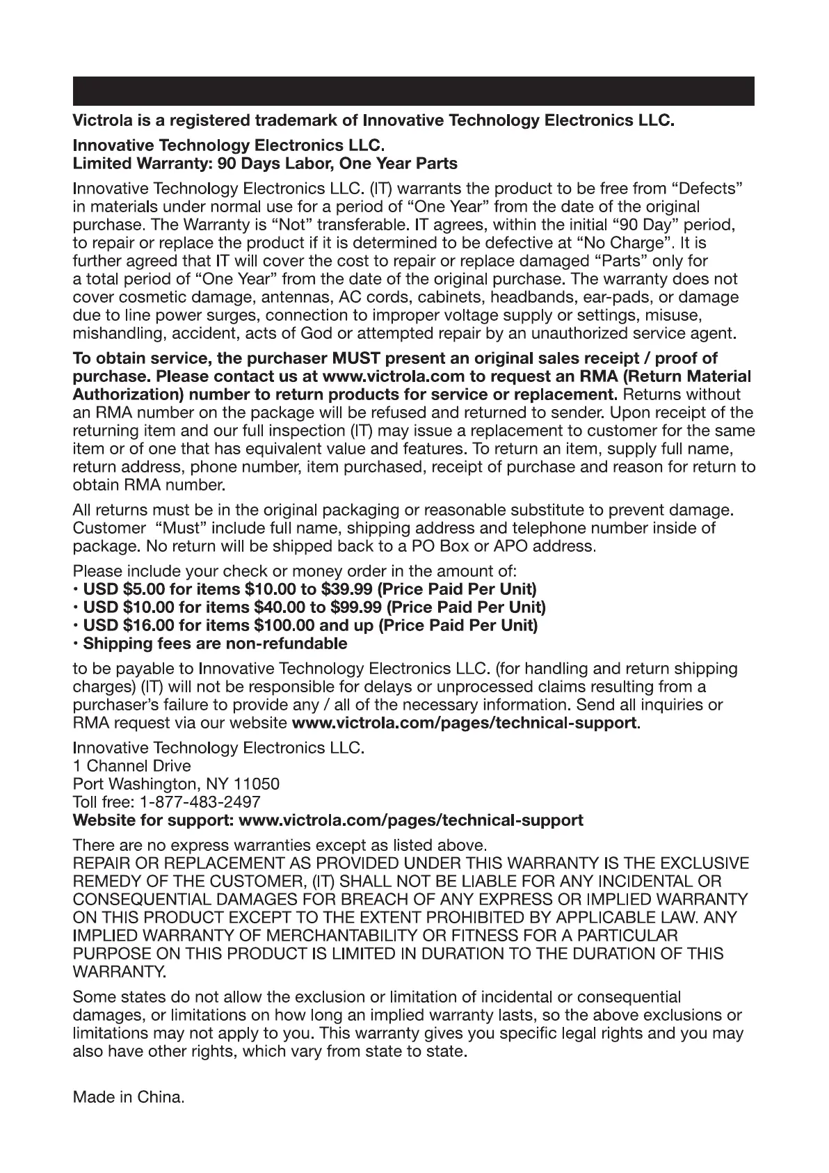 Victrola VA-20 - Warranty Information
