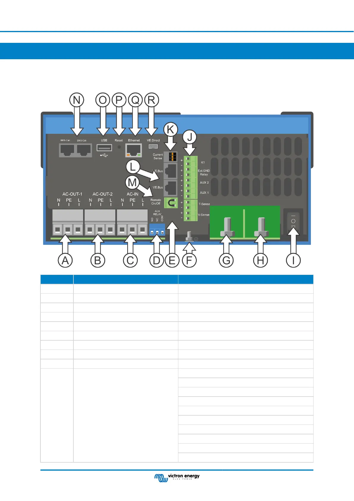A Load connection. AC-OUT-1 Left to right: N (neutral), PE (earth/ground), L (phase)