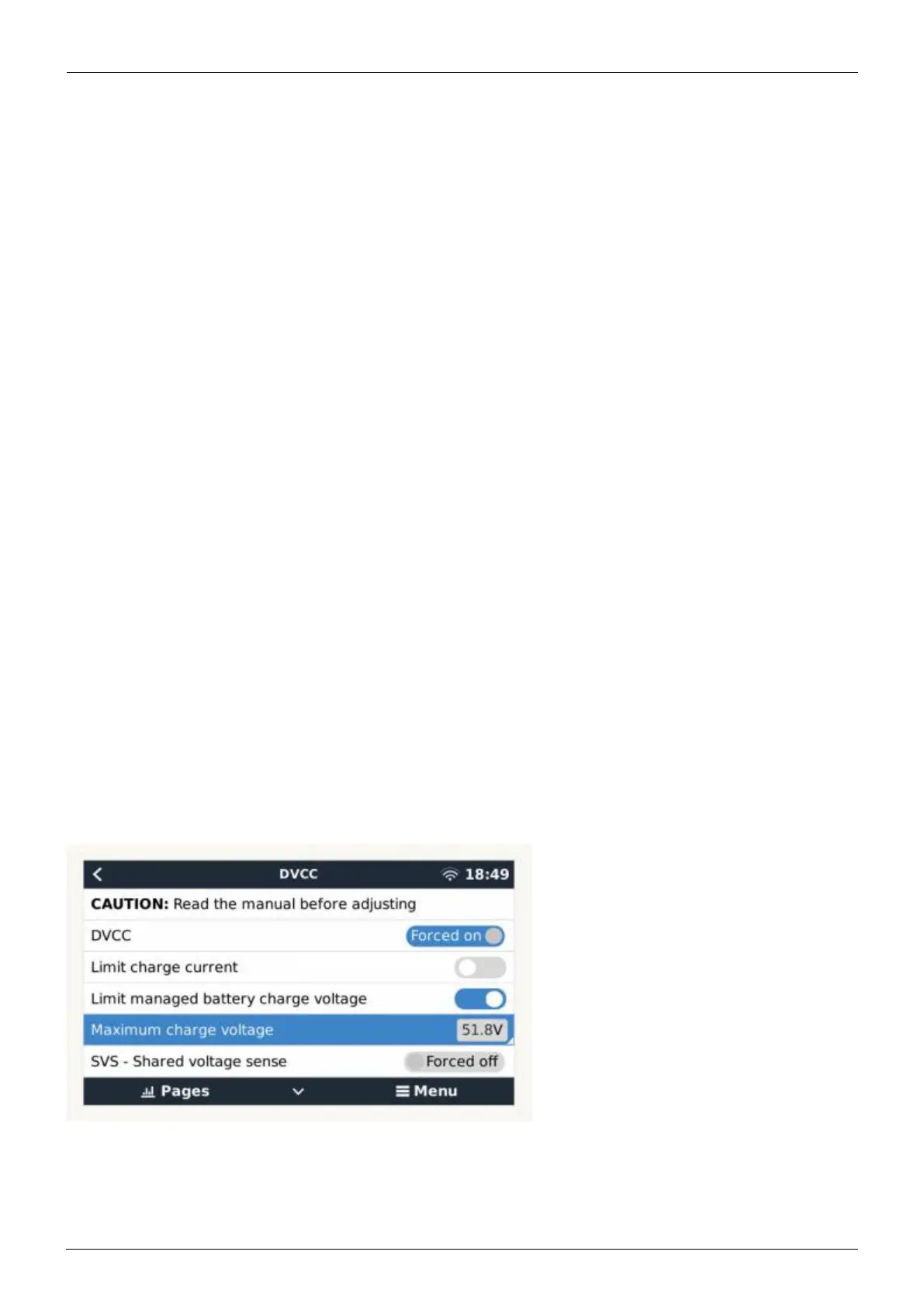 in the DVCC menu of the GX device. Reduce this voltage as necessary until the alarm stops. After