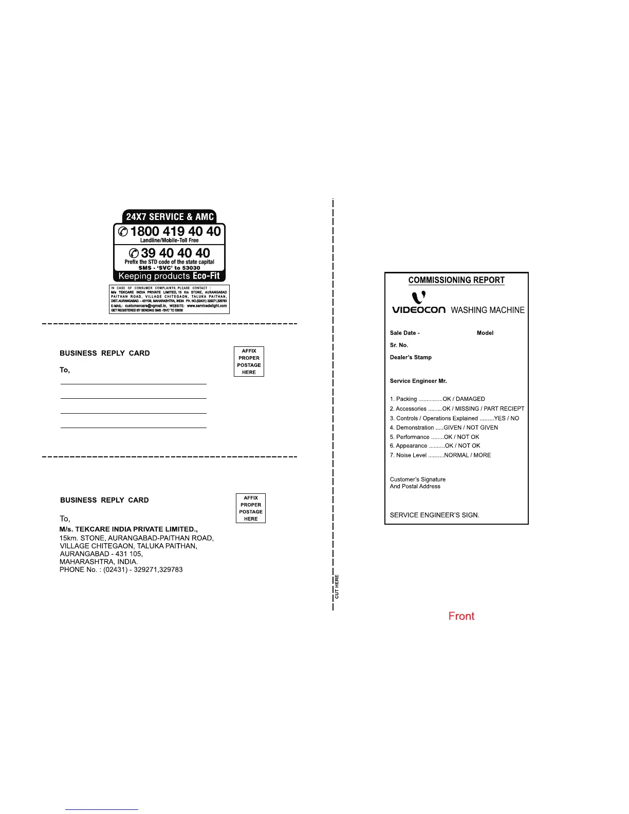 Videocon VT55A11 - Commissioning Report Details; Service Engineer Checklist