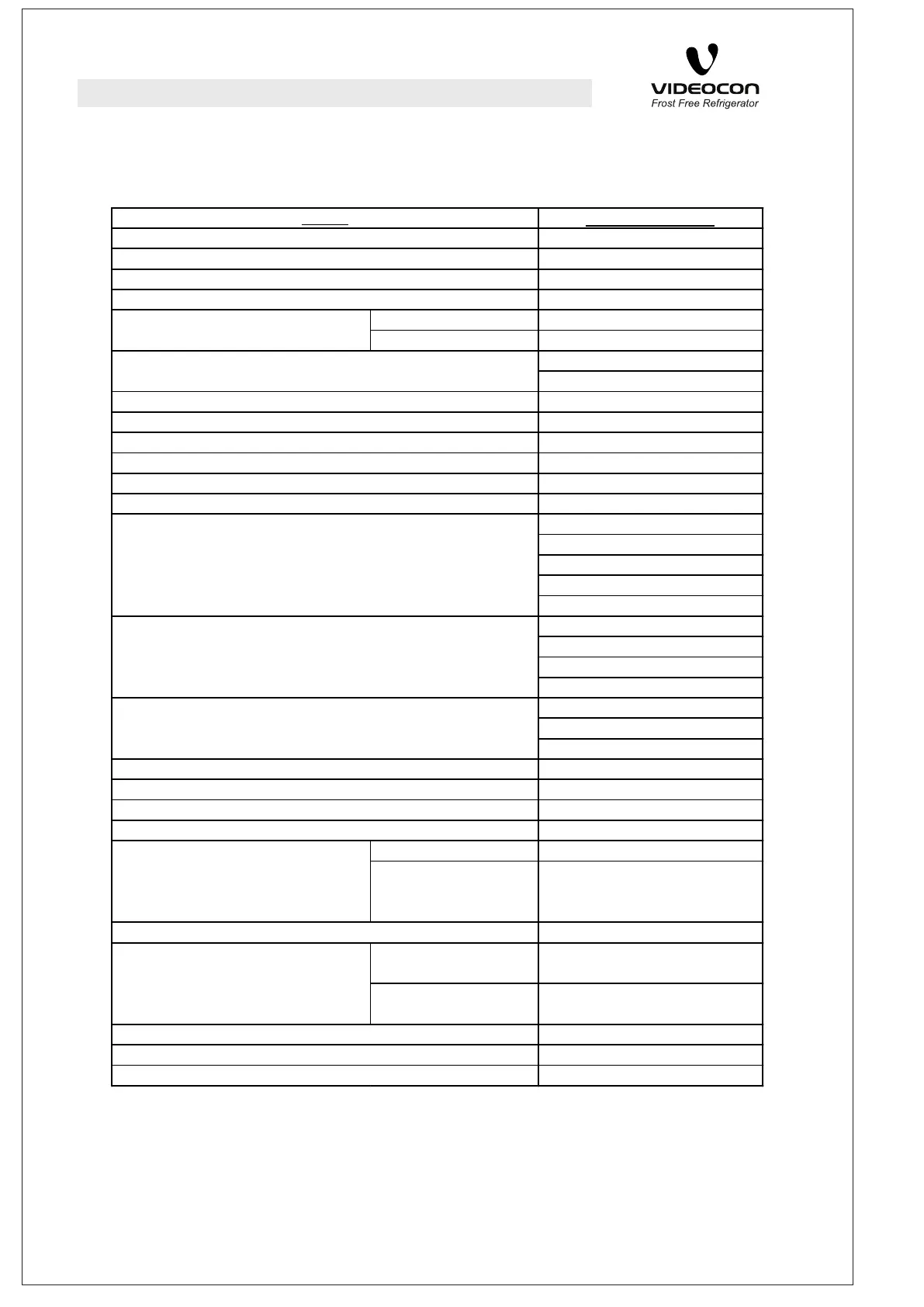 Videocon VZ26 - 280 L Models Specifications