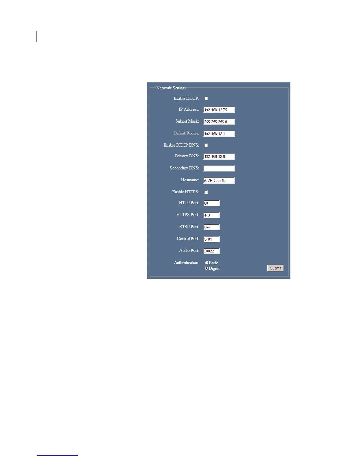 uncheck the Enable DHCP box and fill in the IP Address, Subnet Mask