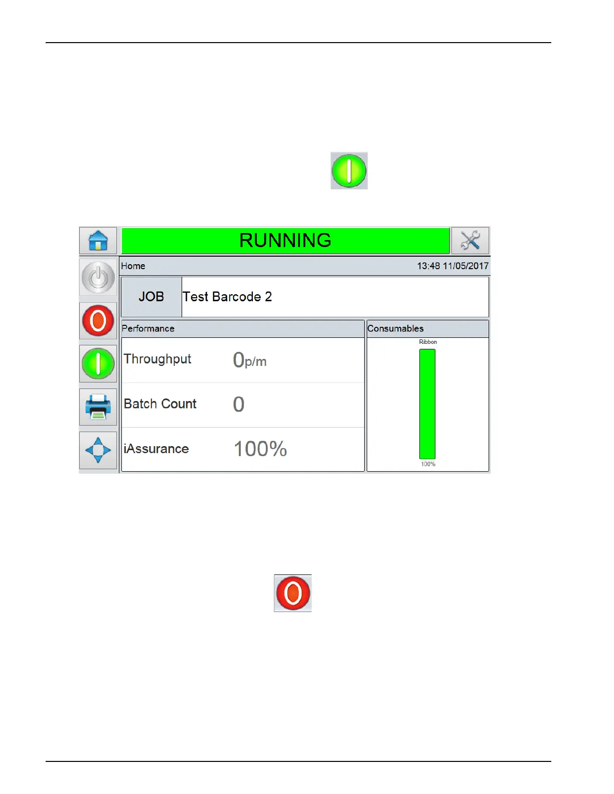 To switch the printer to the RUNNING state, touch .