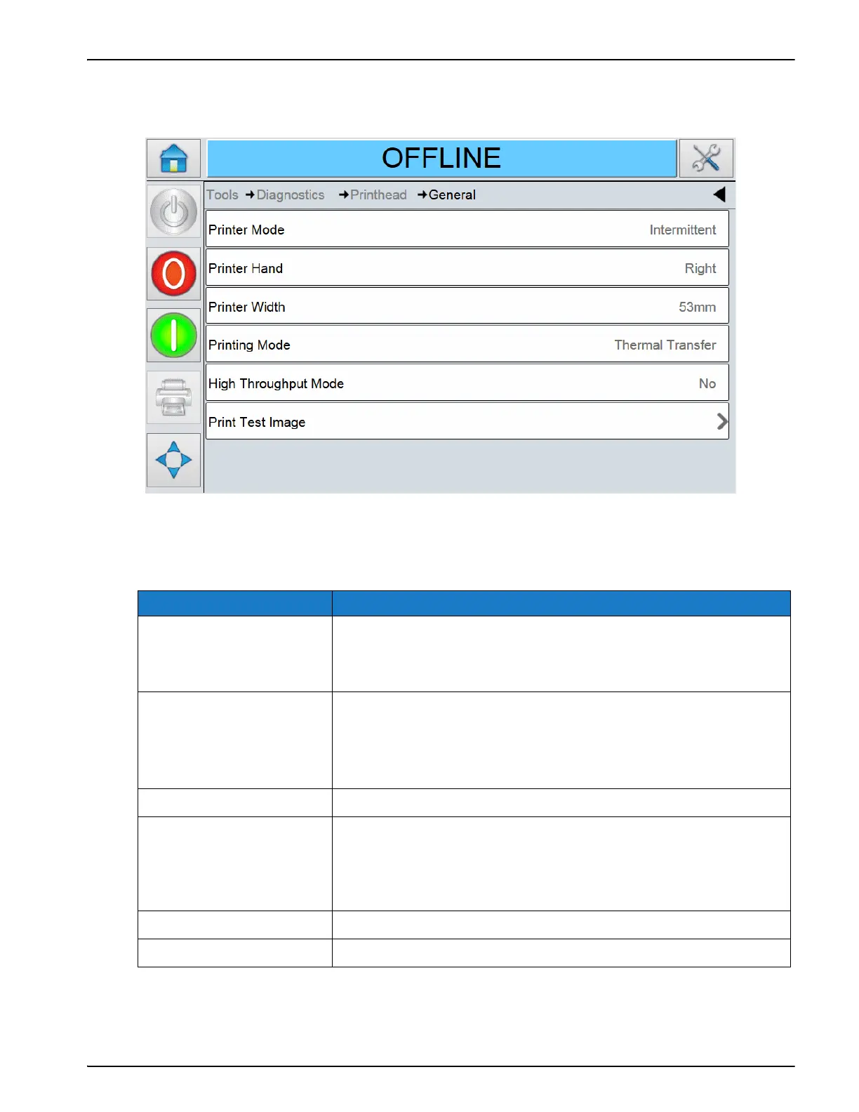 Touch General on the Printhead screen to access the parameters (Figure 5-10).