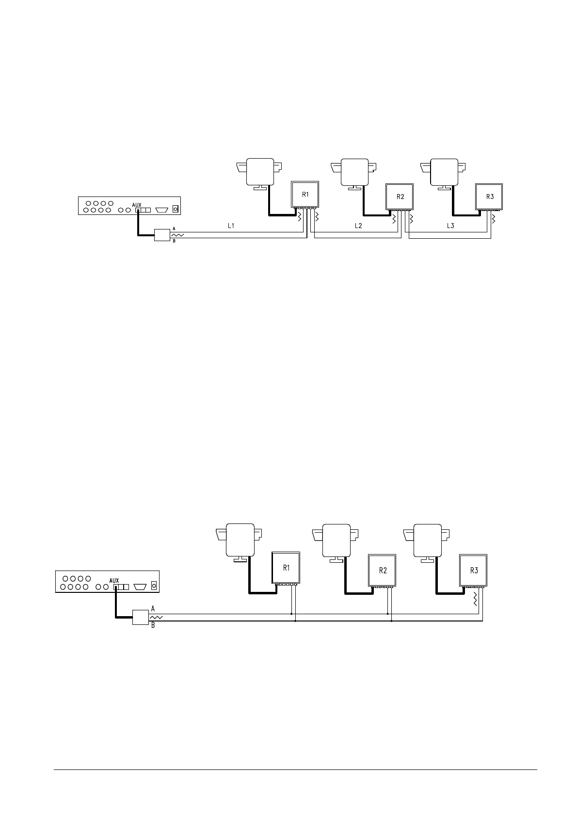 I ricevitori R1, R2 non devono avere la resistenza di terminazione inserita. La lunghezza massima della linea,