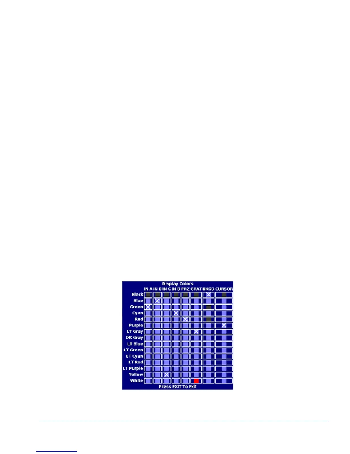 Display Color Selection Screen, shown in Figure 4-3, is used to set the colors. Any