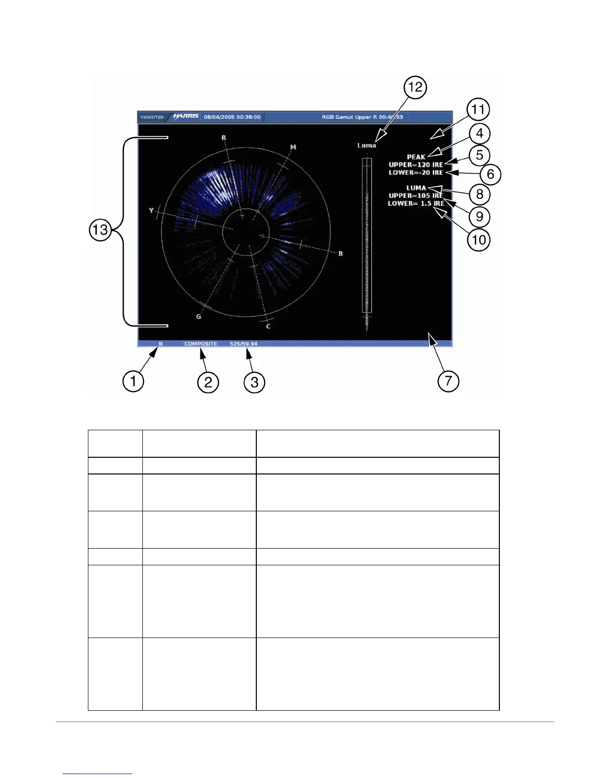 4 Chroma alarm limits Displayed as RGB (for RGB) and PEAK (for Composite)