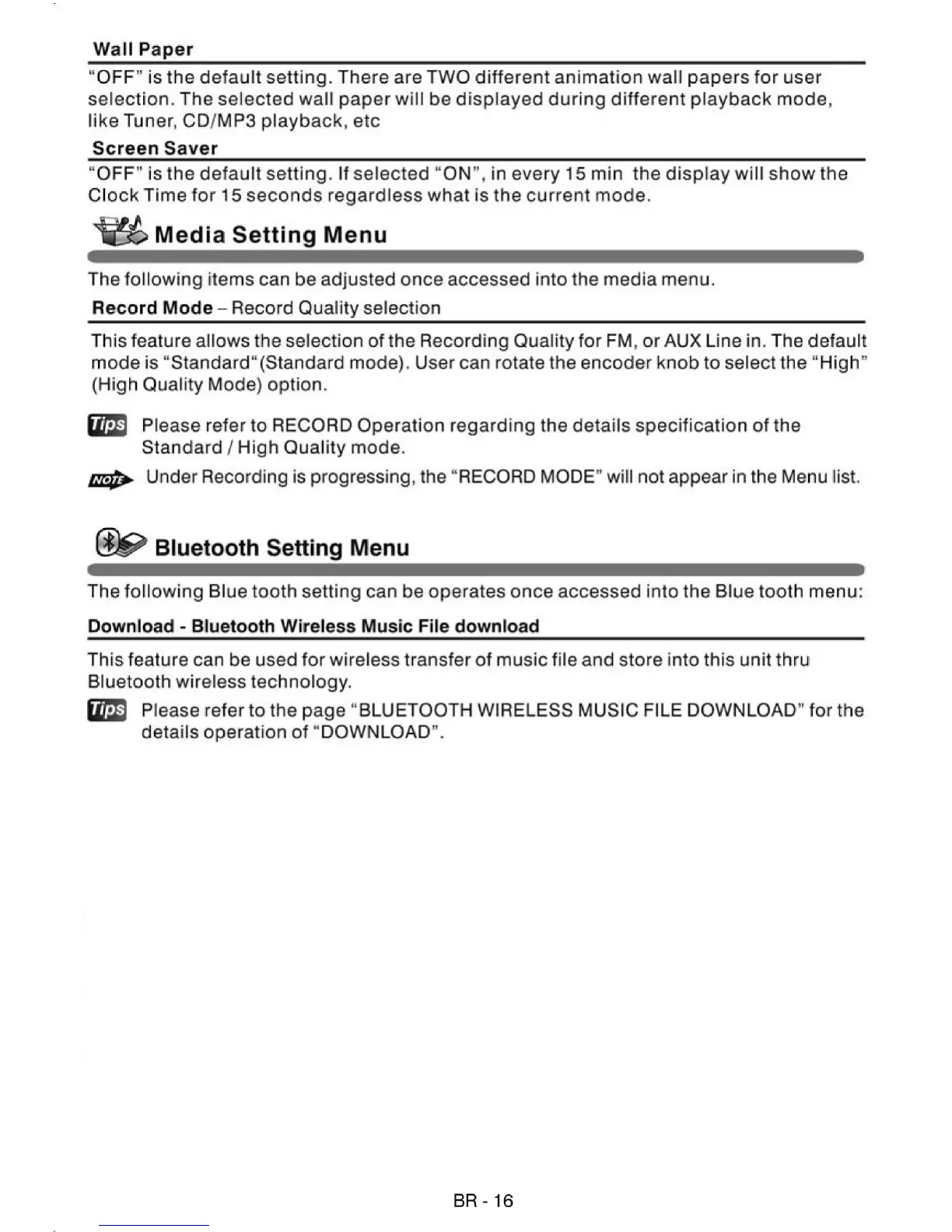 VIETA VPC55BT - Wallpaper and Screen Saver Options; Media Recording Quality Settings; Bluetooth File Download Setup
