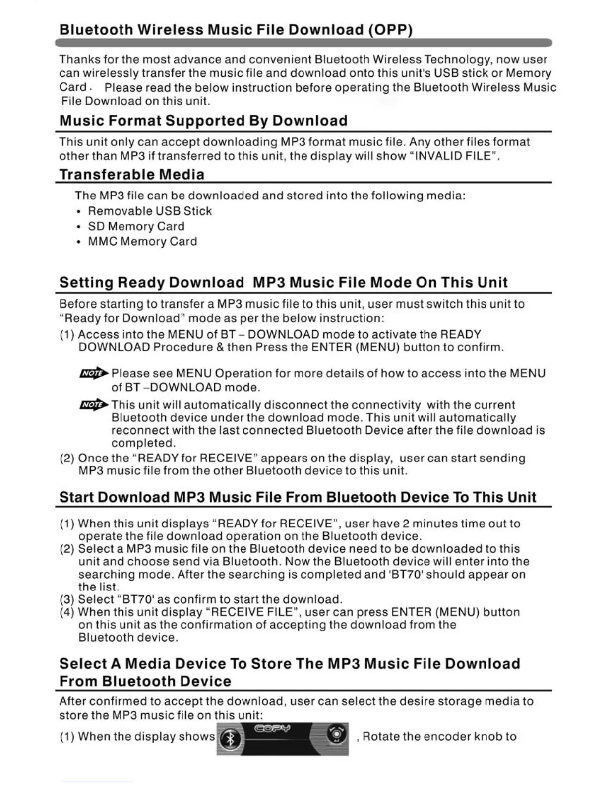 VIETA VPC55BT - Bluetooth Music File Download (OPP); Setting Up for MP3 Download; Starting MP3 File Download