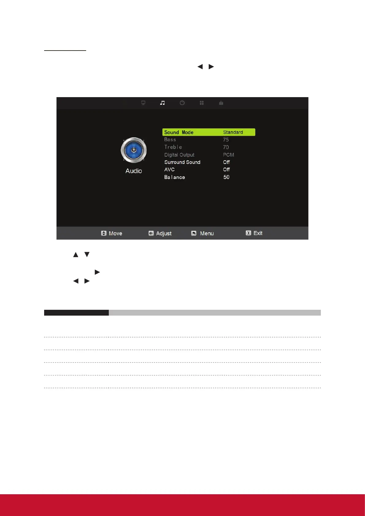 4. Press / button to select among Sound Mode / Bass / Treble / Digital Output /