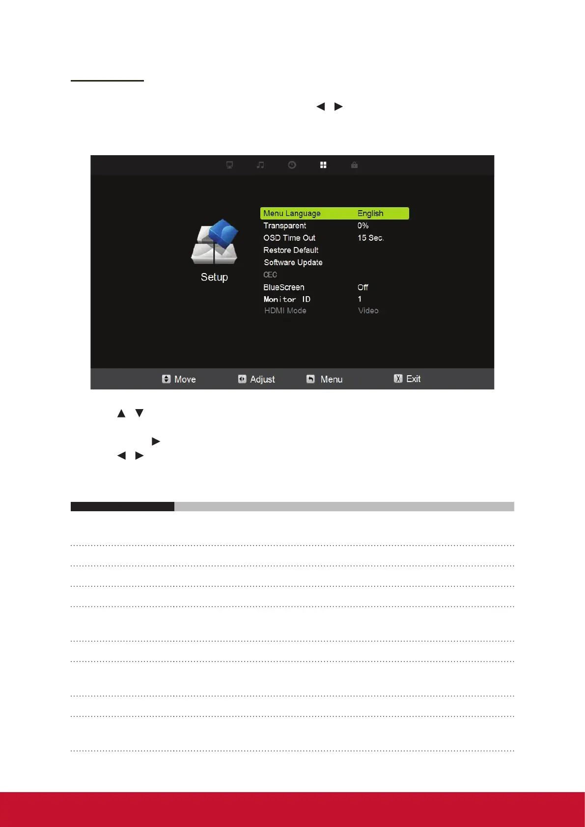 4. Press / button to select Menu Language / Transparent / OSD Time Out /