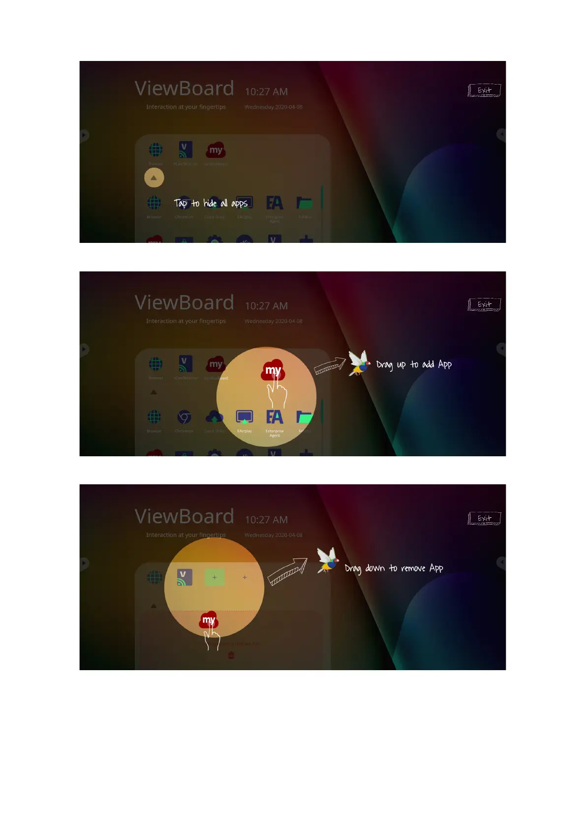 To remove an applicaon shortcut, tap, hold, and drag the icon down.