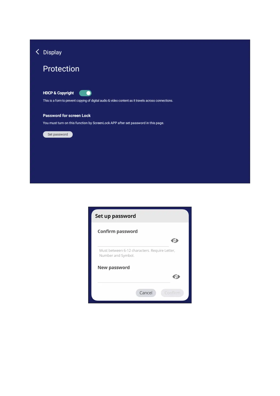 Toggle HDCP & Copyright and set a Password for Screen Lock.