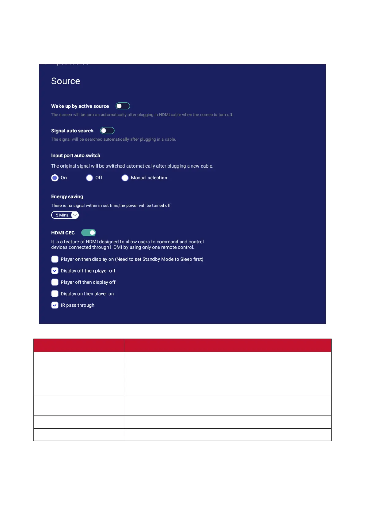 Toggle Wake up by acve source, Signal auto search, and HDMI CEC and select Input