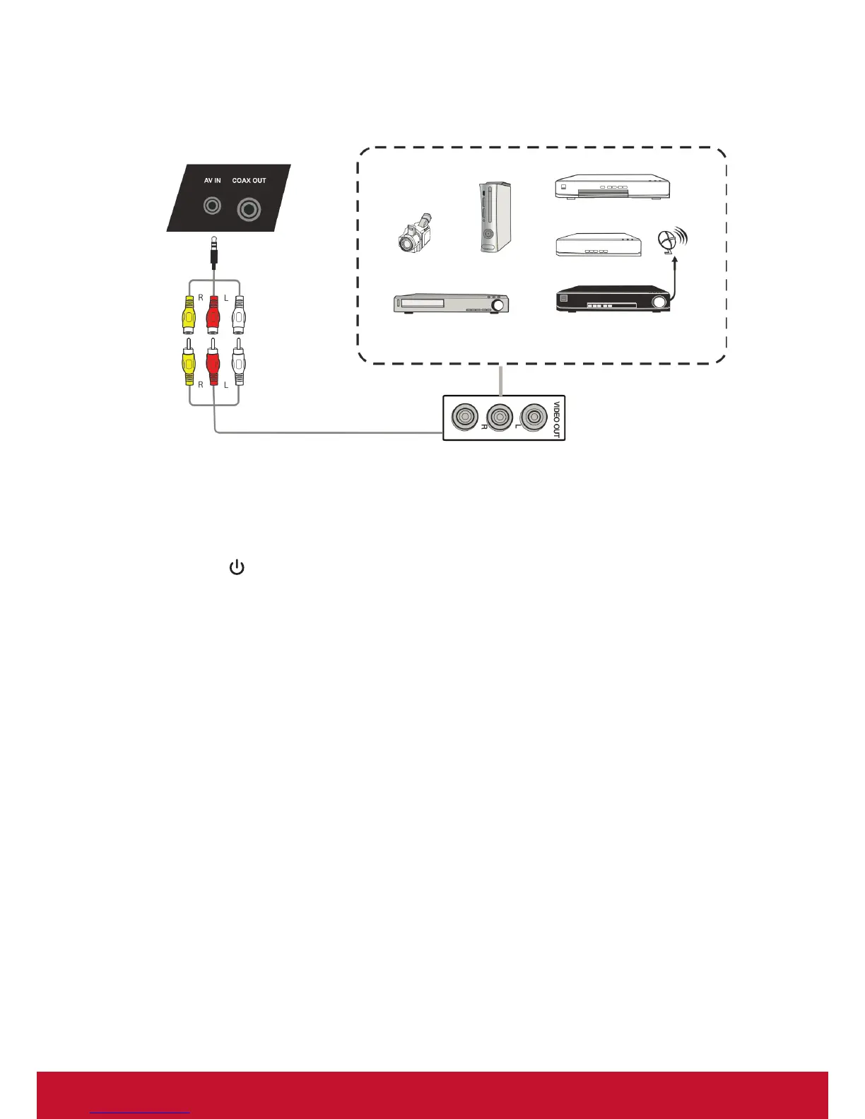 ports of a peripheral device (AV cable: Yellow is Video, Red is Audio-R, White is