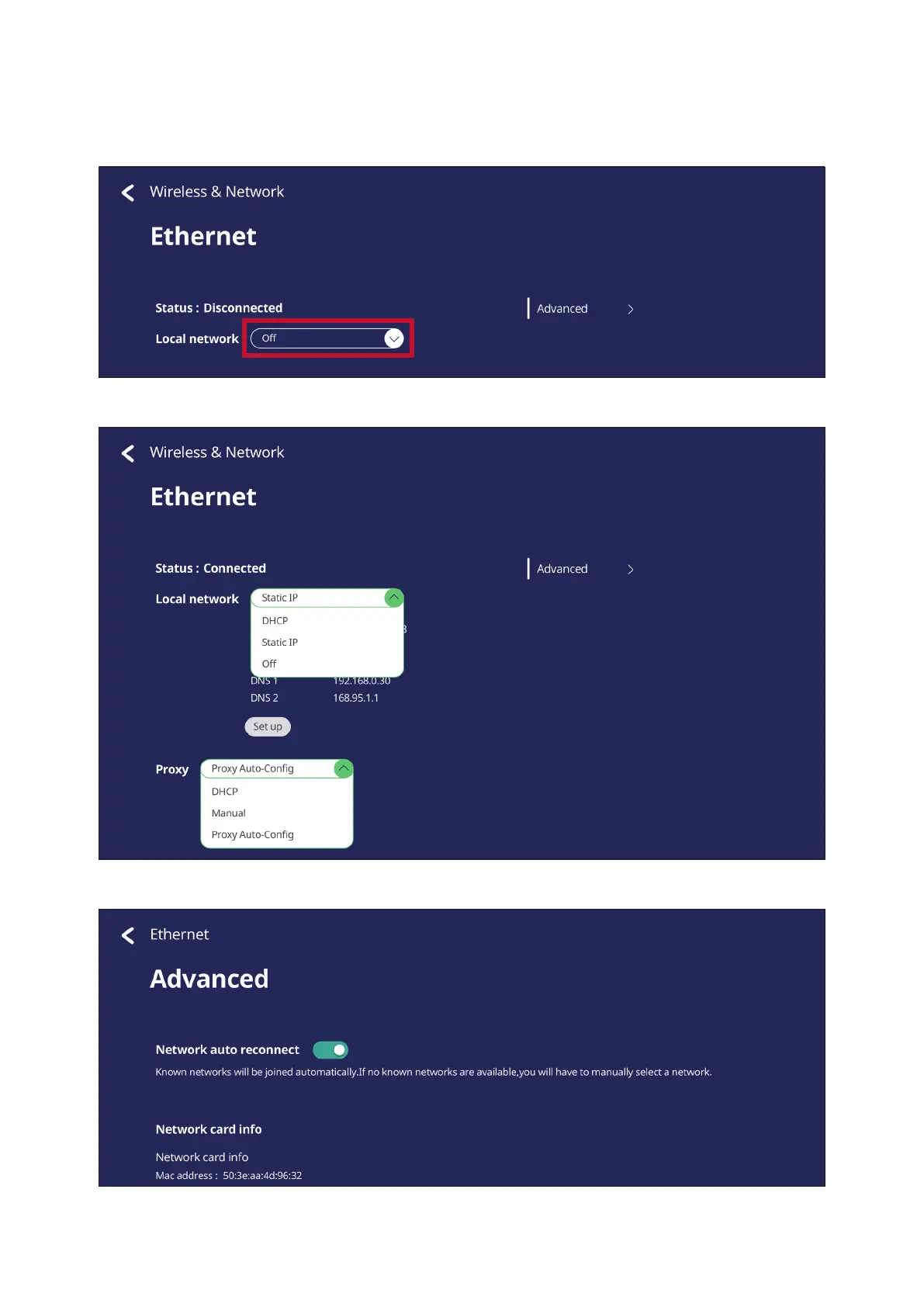 Tap the drop down menu to connect/disconnect the Ethernet.