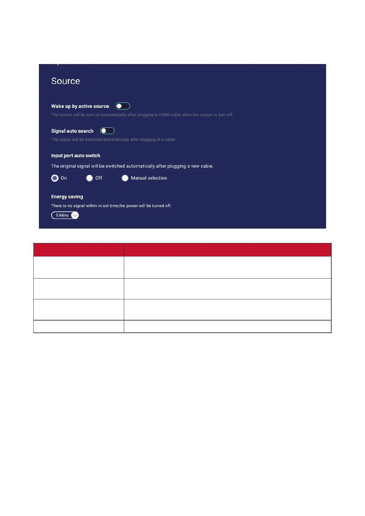 Toggle Wake up by acve source, Signal auto search, and HDMI CEC and select Input