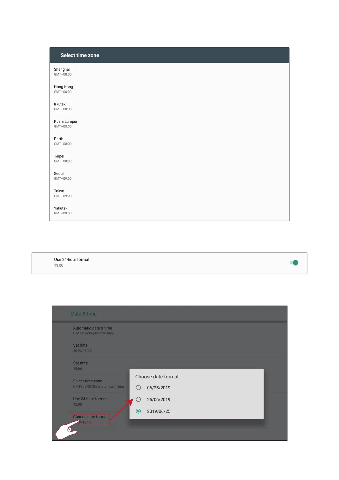 Choose from 12 hour and 24 hour me format. Toggle 24-hour format on/o.