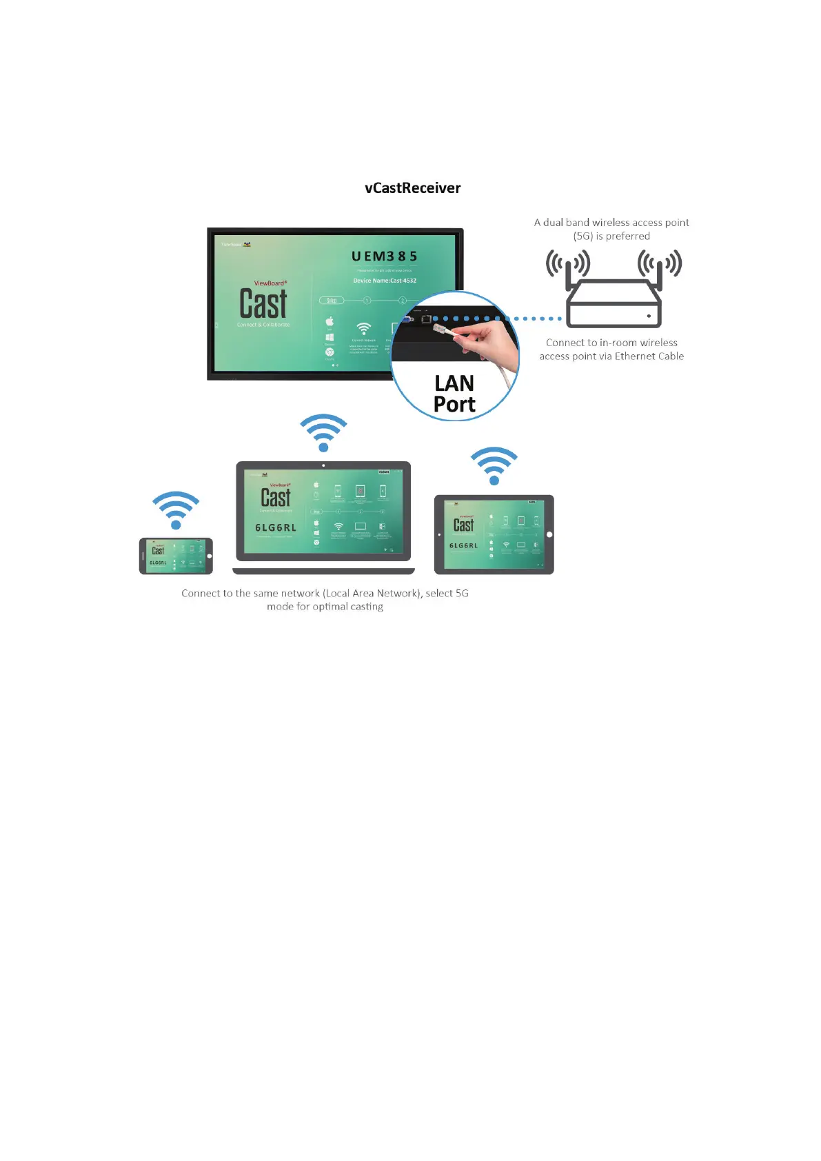 ViewBoard Cast is a wireless peer to peer data communicaon, therefore the below